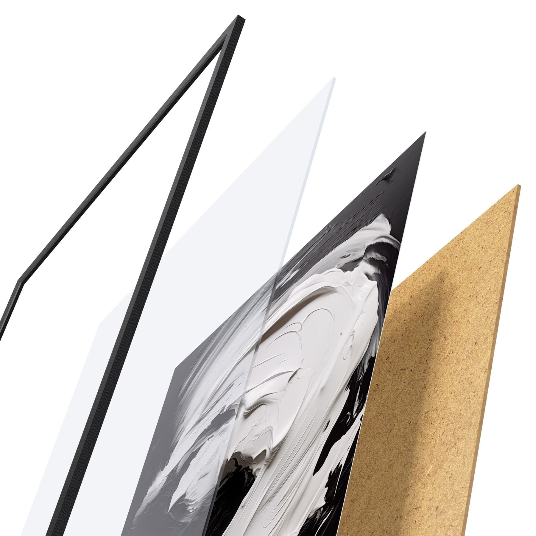El póster consta de marco, plexiglás, imagen impresa y soporte de aglomerado. El póster puede colgarse inmediatamente en la pared gracias a los soportes de la parte posterior.