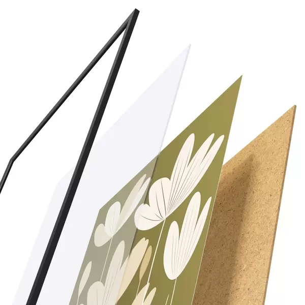 El póster consta de marco, plexiglás, imagen impresa y soporte de aglomerado. El póster puede colgarse inmediatamente en la pared gracias a los soportes de la parte posterior.