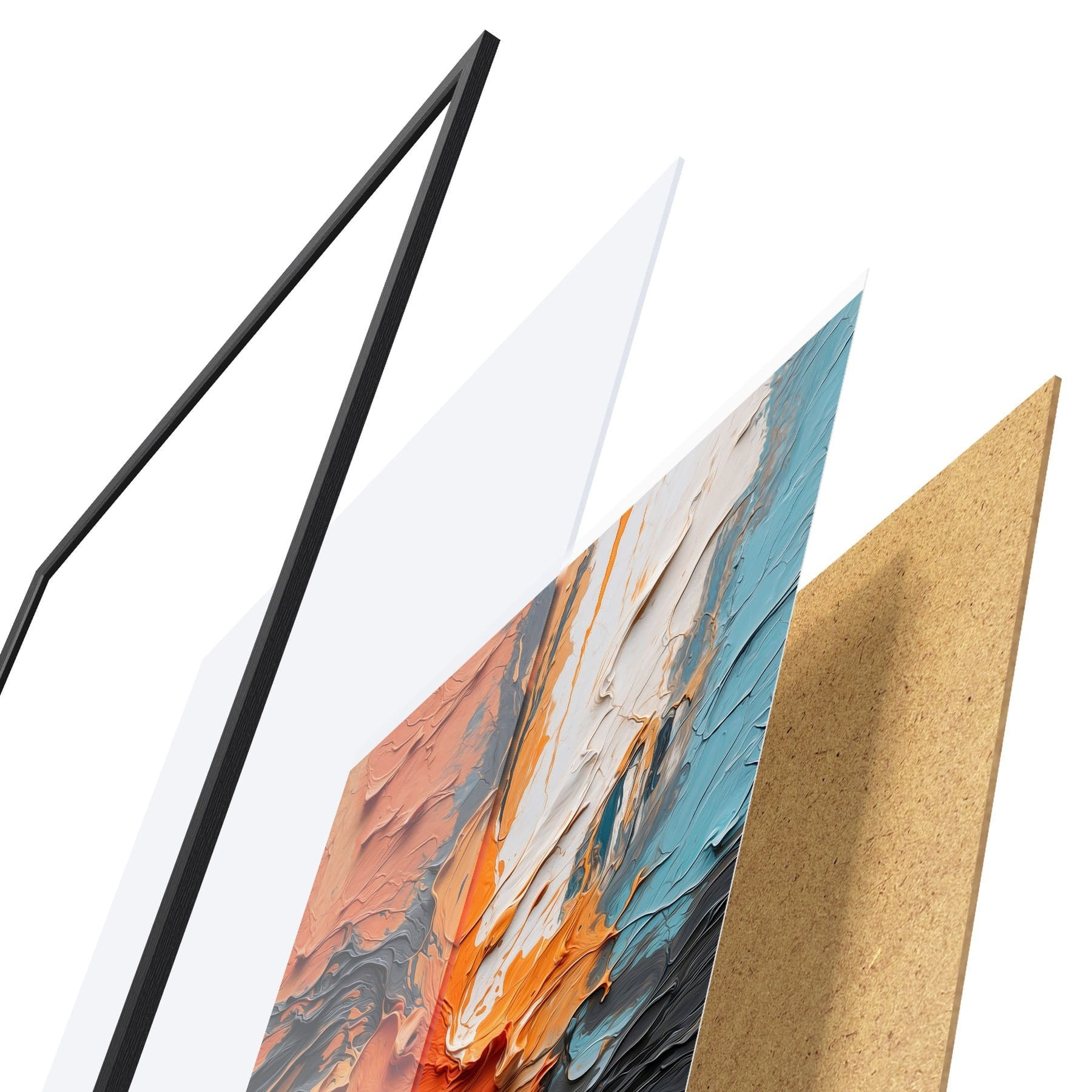 El póster consta de marco, plexiglás, imagen impresa y soporte de aglomerado. El póster puede colgarse inmediatamente en la pared gracias a los soportes de la parte posterior.