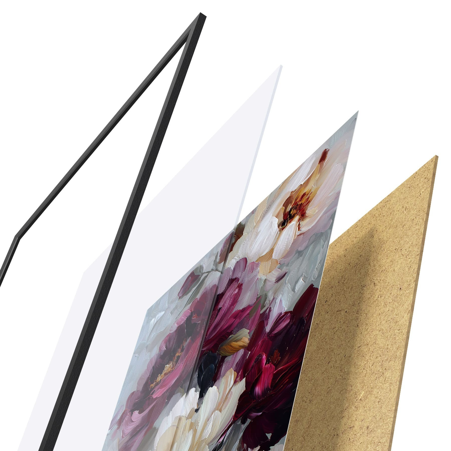 El póster consta de marco, plexiglás, imagen impresa y soporte de aglomerado. El póster puede colgarse inmediatamente en la pared gracias a los soportes de la parte posterior.