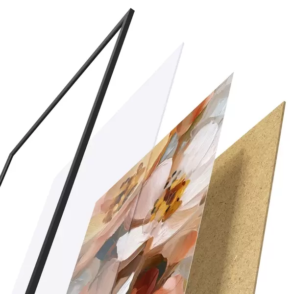El póster consta de marco, plexiglás, imagen impresa y soporte de aglomerado. El póster puede colgarse inmediatamente en la pared gracias a los soportes de la parte posterior.