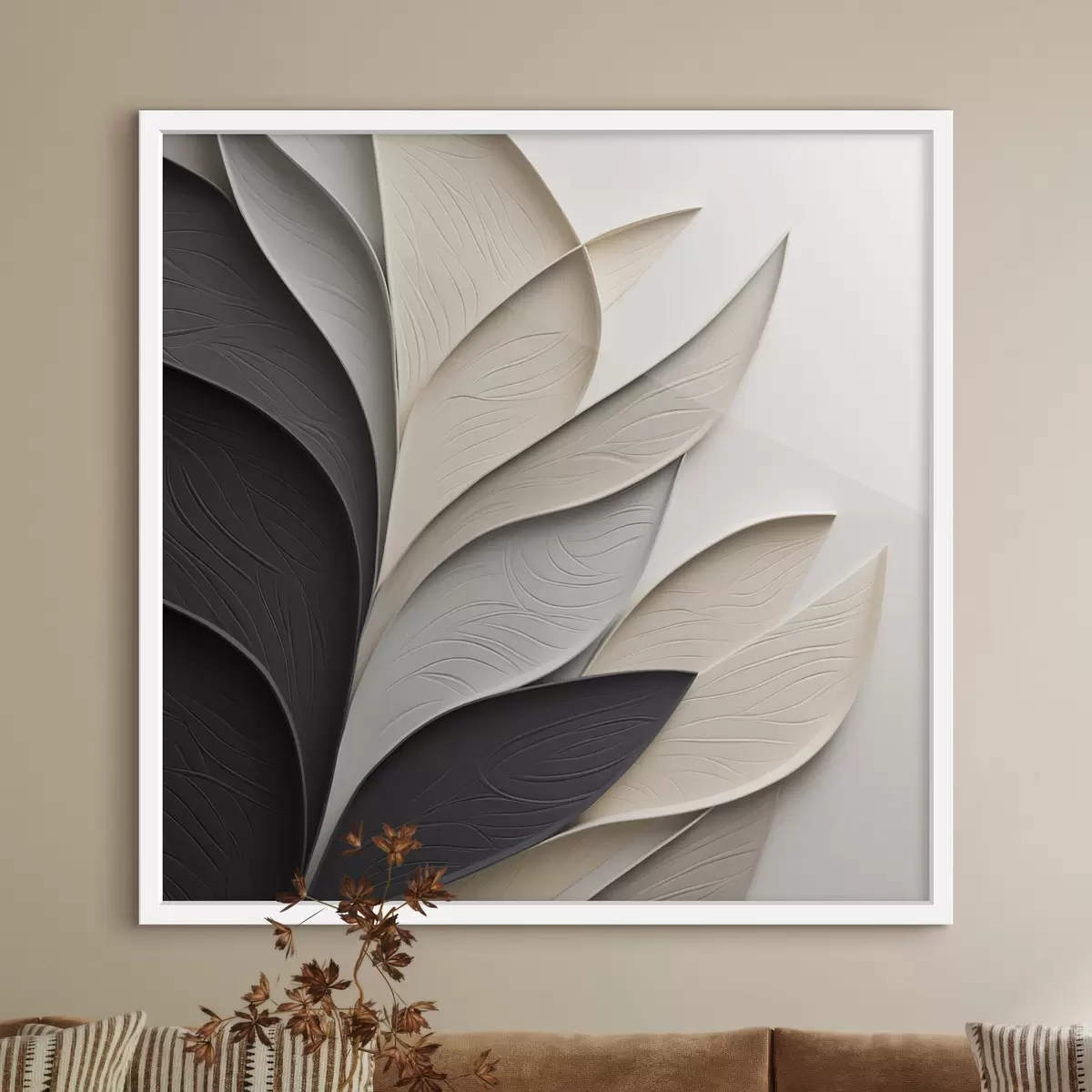 Poster Composición abstracta de hojas superpuestas, formas curvas en negro, blanco y beige, arte texturizado Nr f48382