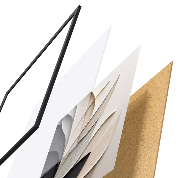 El póster consta de marco, plexiglás, imagen impresa y soporte de aglomerado. El póster puede colgarse inmediatamente en la pared gracias a los soportes de la parte posterior.