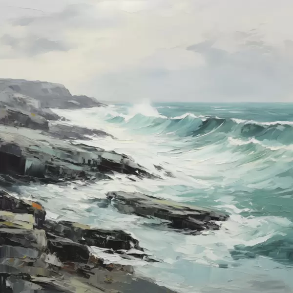 Poster Un paisaje de costa rocosa con olas bajo un cielo nublado, estilo pictórico f48387