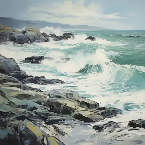 Poster Un paisaje de costa rocosa con olas bajo un cielo nublado, estilo pictórico f48388