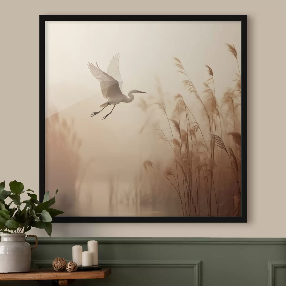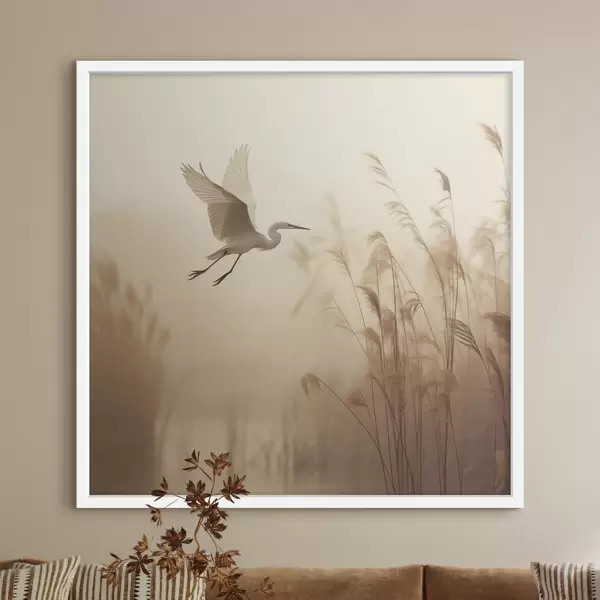 Poster Una garza blanca sobrevuela un lago, rodeada de altos juncos y árboles al fondo f48390