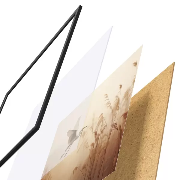 El póster consta de marco, plexiglás, imagen impresa y soporte de aglomerado. El póster puede colgarse inmediatamente en la pared gracias a los soportes de la parte posterior.