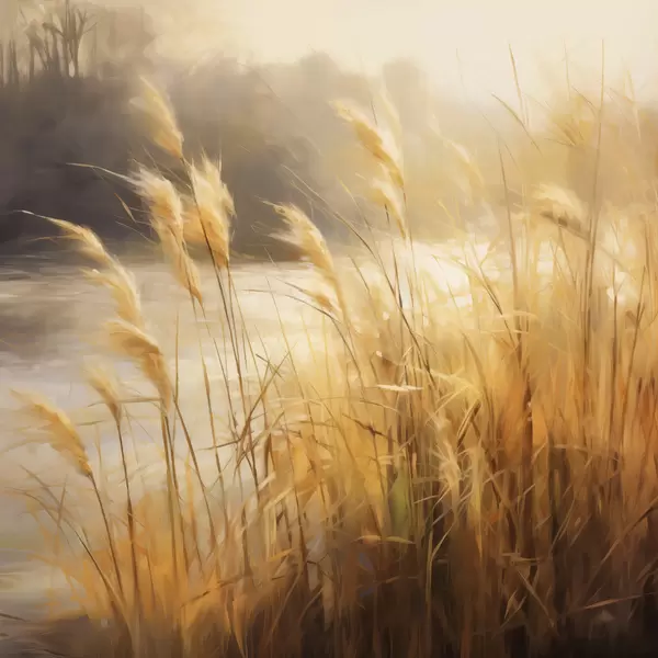 Poster Hierba alta y seca con espiguillas en primer plano, con un lago y árboles al fondo Nr f48394
