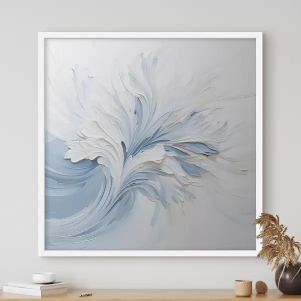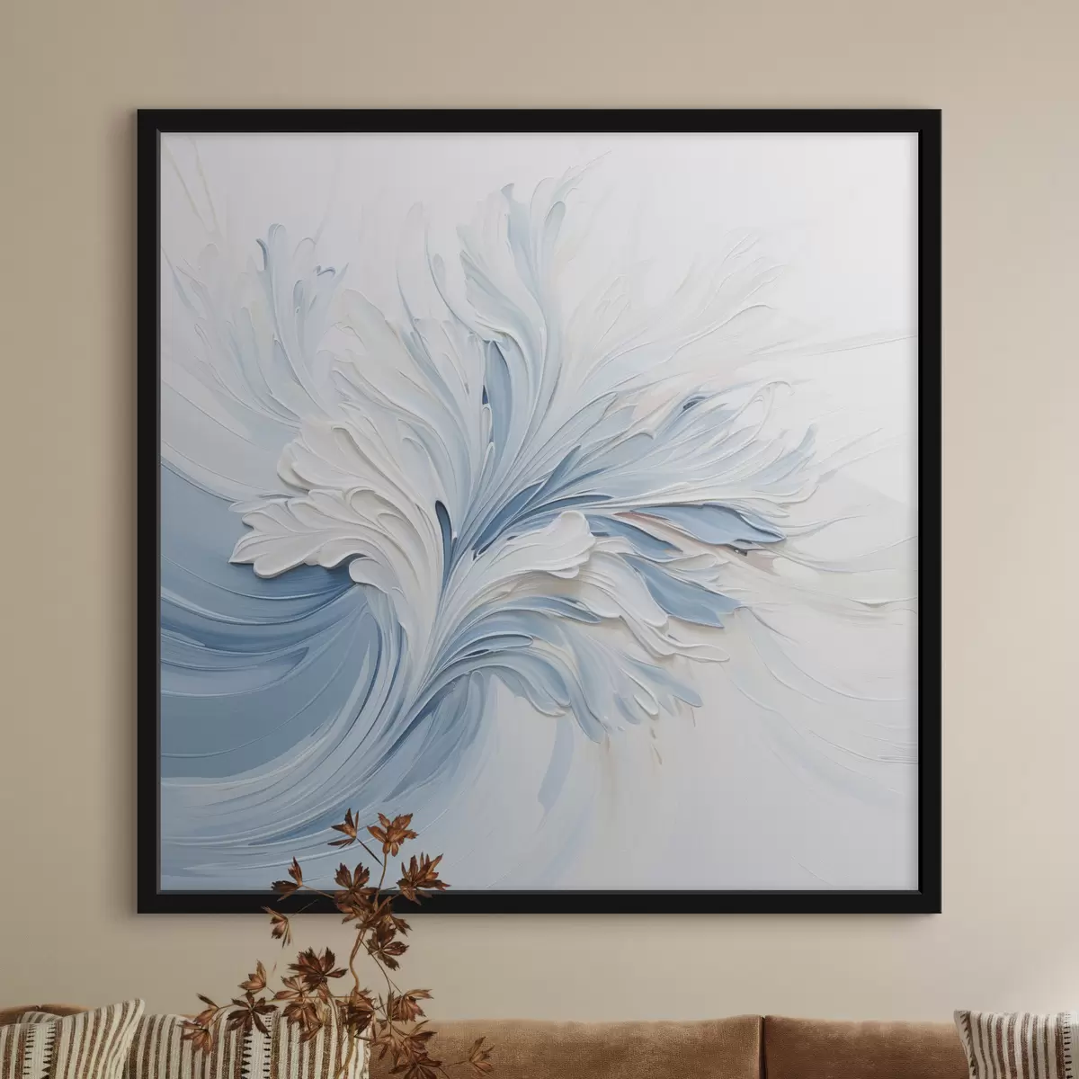 Poster Un diseño floral abstracto en blanco y azul claro, con pétalos texturizados y líneas onduladas Nr f48395
