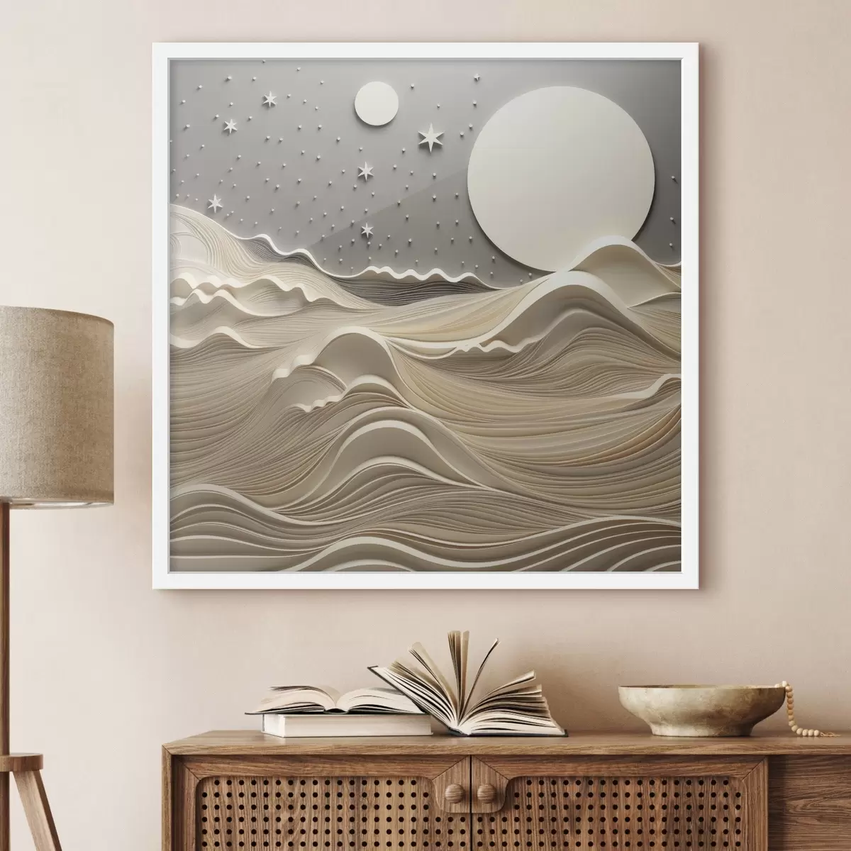 Poster Un paisaje minimalista y estilizado con colinas onduladas y una gran luna en un cielo estrellado; arte abstracto Nr f48401