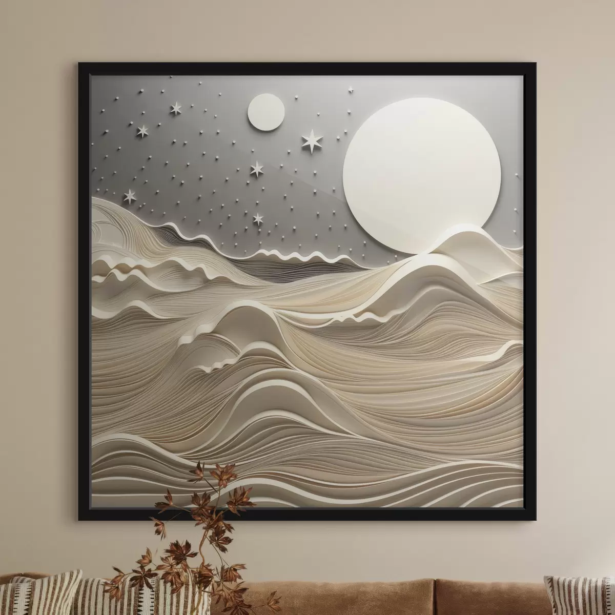 Poster Un paisaje minimalista y estilizado con colinas onduladas y una gran luna en un cielo estrellado; arte abstracto f48401