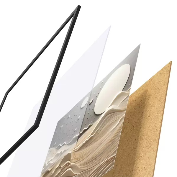 El póster consta de marco, plexiglás, imagen impresa y soporte de aglomerado. El póster puede colgarse inmediatamente en la pared gracias a los soportes de la parte posterior.