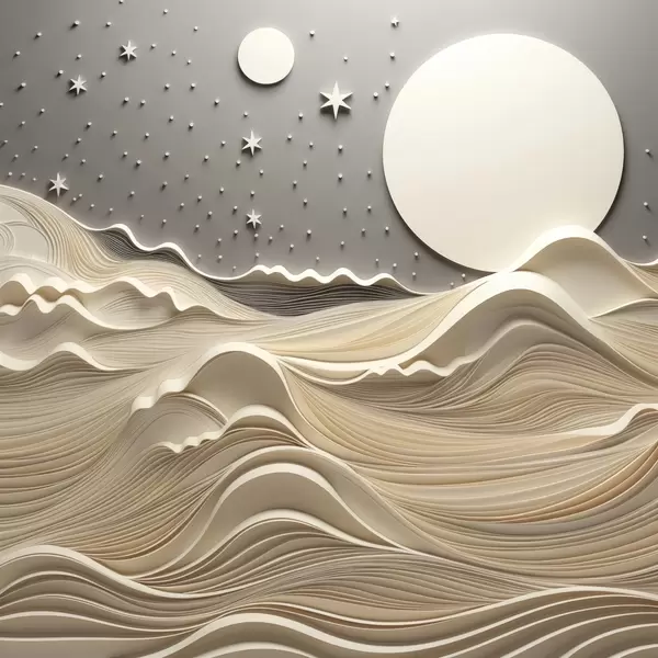 Poster Un paisaje minimalista y estilizado con colinas onduladas y una gran luna en un cielo estrellado; arte abstracto f48401