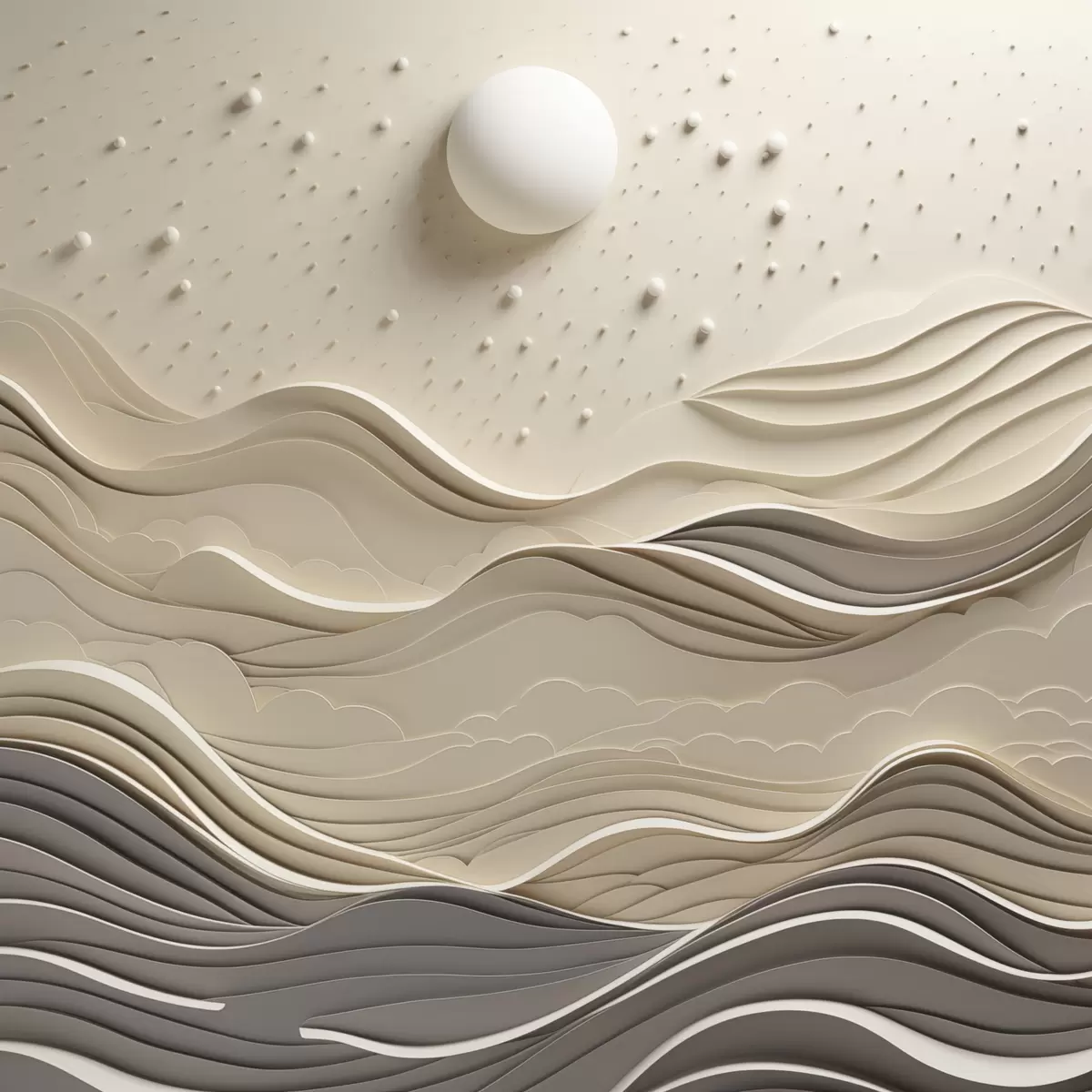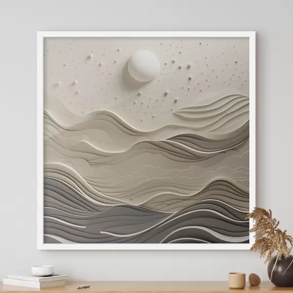Poster Un paisaje minimalista y estilizado con colinas onduladas y una gran luna en un cielo estrellado; arte abstracto f48402