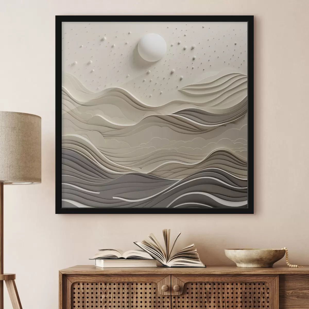 Poster Un paisaje minimalista y estilizado con colinas onduladas y una gran luna en un cielo estrellado; arte abstracto Nr f48402