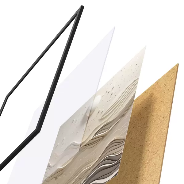 El póster consta de marco, plexiglás, imagen impresa y soporte de aglomerado. El póster puede colgarse inmediatamente en la pared gracias a los soportes de la parte posterior.