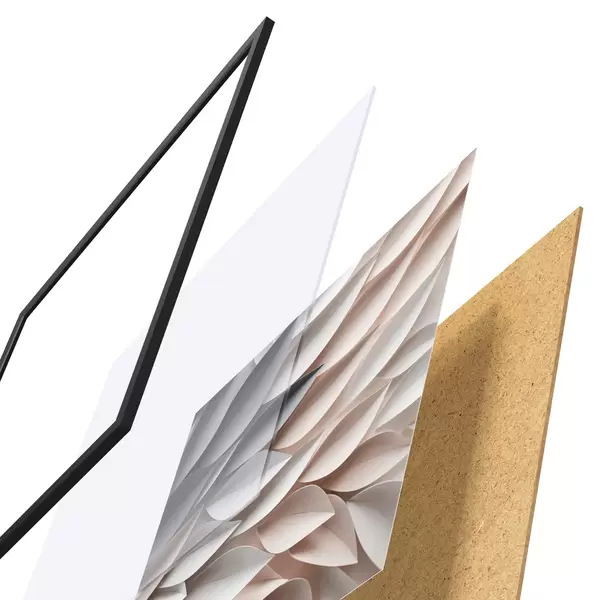 El póster consta de marco, plexiglás, imagen impresa y soporte de aglomerado. El póster puede colgarse inmediatamente en la pared gracias a los soportes de la parte posterior.