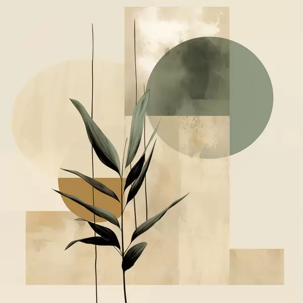 Poster Una planta de color verde oscuro con formas geométricas abstractas y texturas de acuarela en tonos beige y verde Nr f48409
