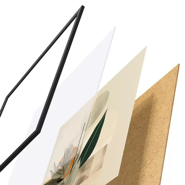 El póster consta de marco, plexiglás, imagen impresa y soporte de aglomerado. El póster puede colgarse inmediatamente en la pared gracias a los soportes de la parte posterior.