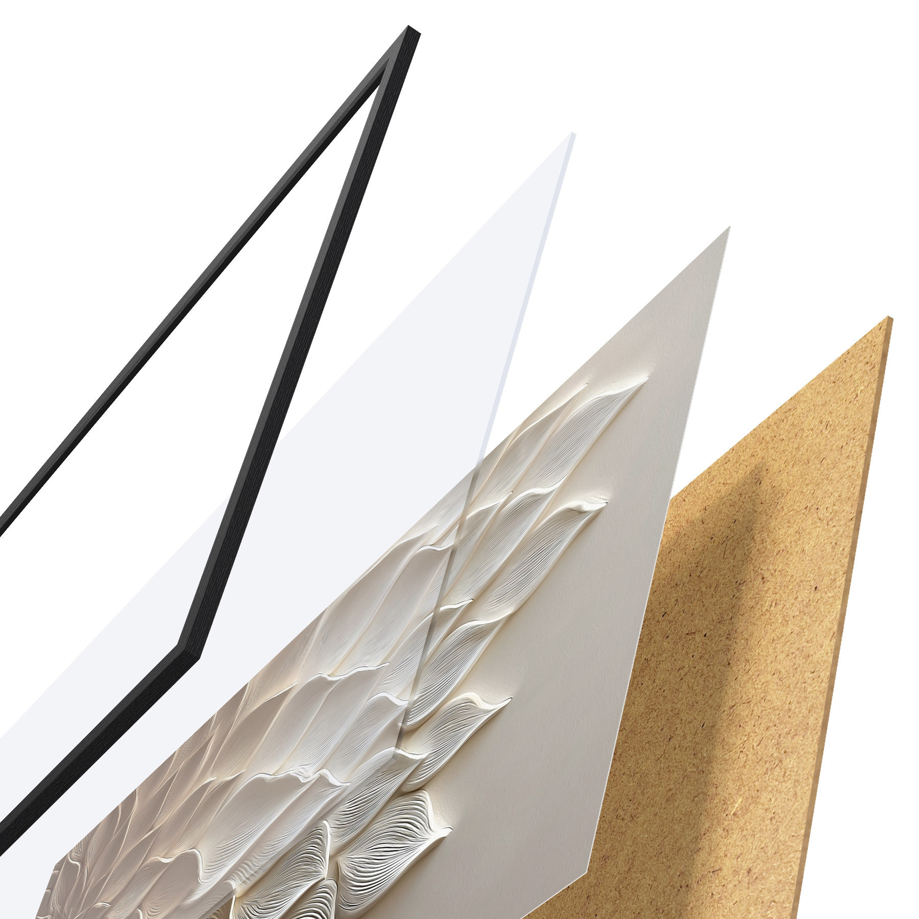 El póster consta de marco, plexiglás, imagen impresa y soporte de aglomerado. El póster puede colgarse inmediatamente en la pared gracias a los soportes de la parte posterior.
