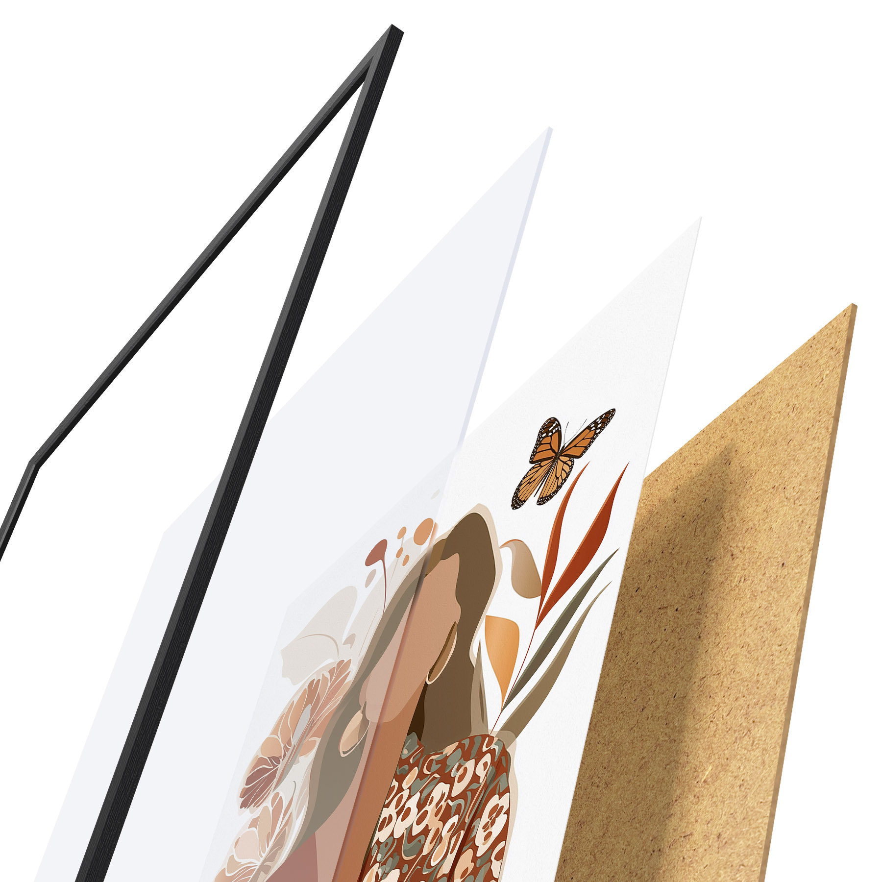 El póster consta de marco, plexiglás, imagen impresa y soporte de aglomerado. El póster puede colgarse inmediatamente en la pared gracias a los soportes de la parte posterior.