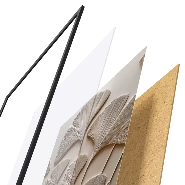 El póster consta de marco, plexiglás, imagen impresa y soporte de aglomerado. El póster puede colgarse inmediatamente en la pared gracias a los soportes de la parte posterior.