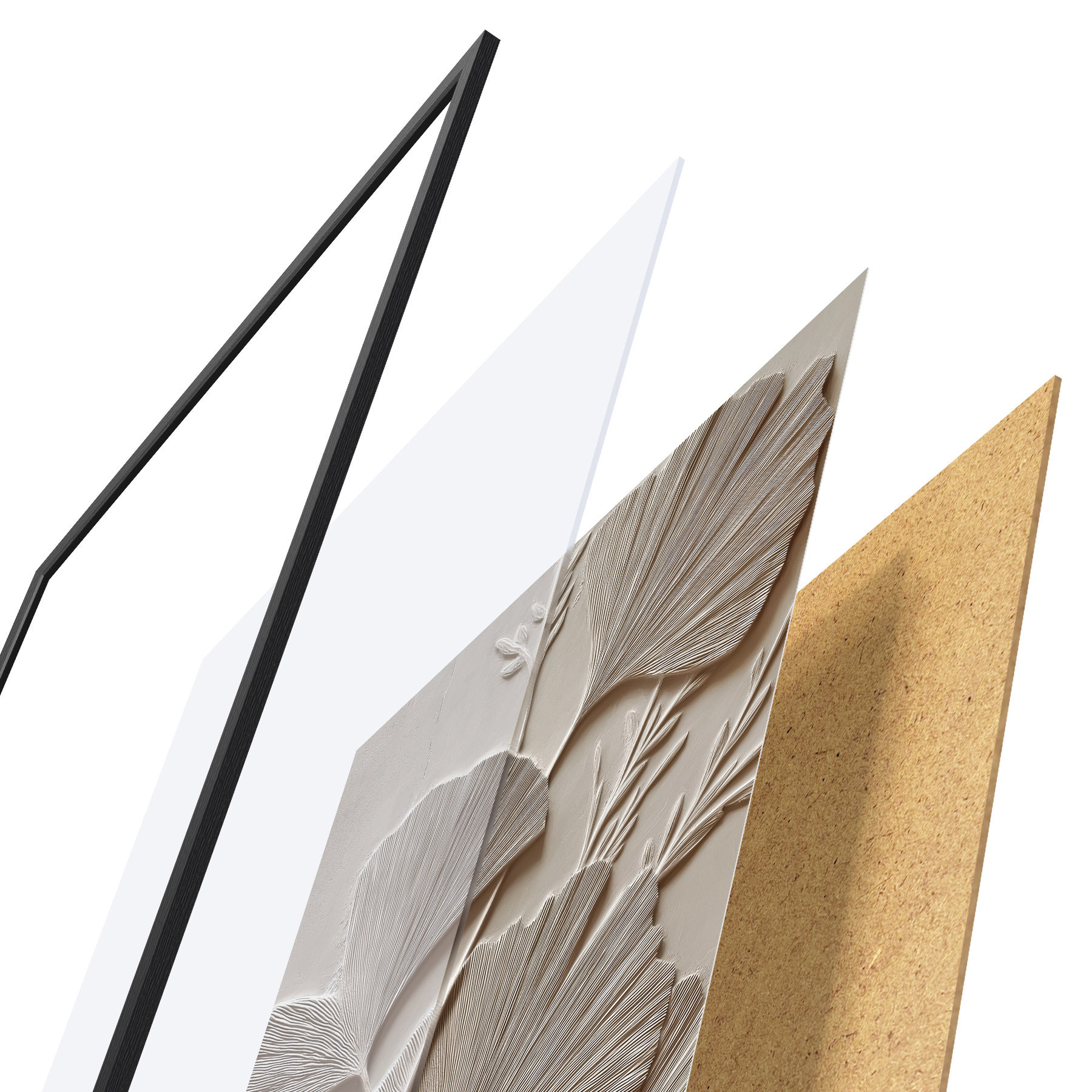 El póster consta de marco, plexiglás, imagen impresa y soporte de aglomerado. El póster puede colgarse inmediatamente en la pared gracias a los soportes de la parte posterior.