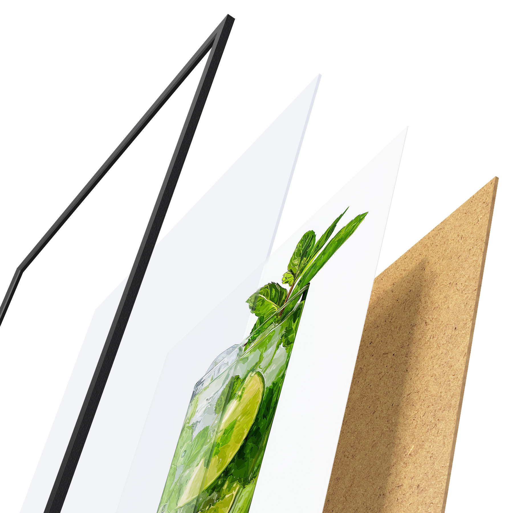 El póster consta de marco, plexiglás, imagen impresa y soporte de aglomerado. El póster puede colgarse inmediatamente en la pared gracias a los soportes de la parte posterior.