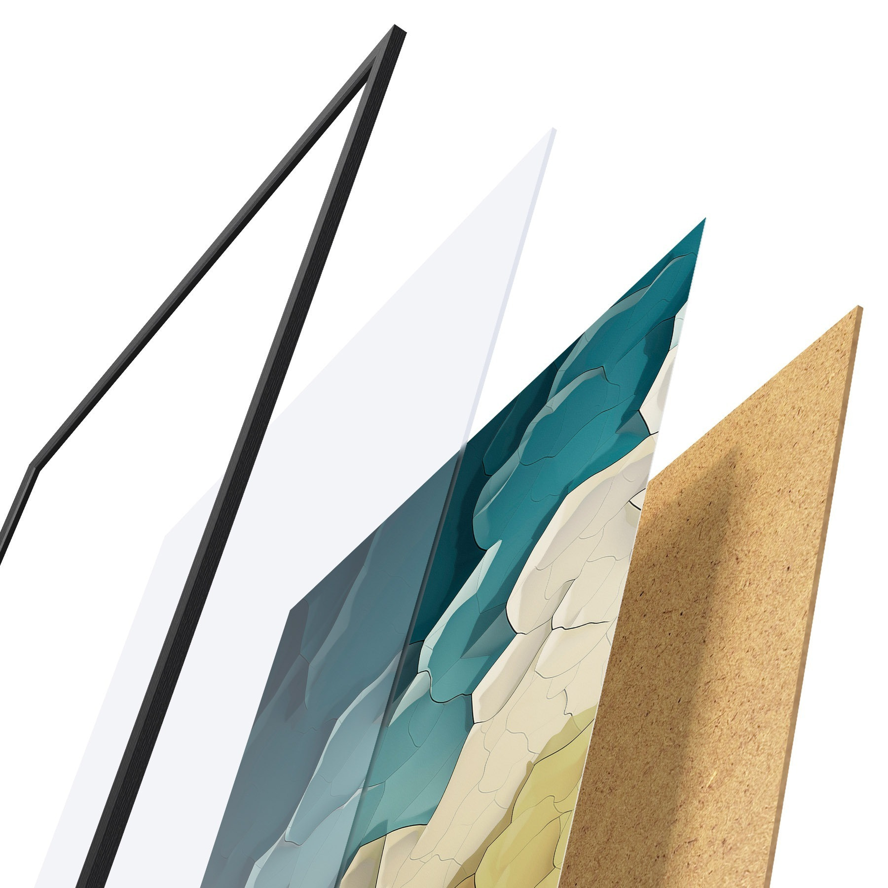 El póster consta de marco, plexiglás, imagen impresa y soporte de aglomerado. El póster puede colgarse inmediatamente en la pared gracias a los soportes de la parte posterior.