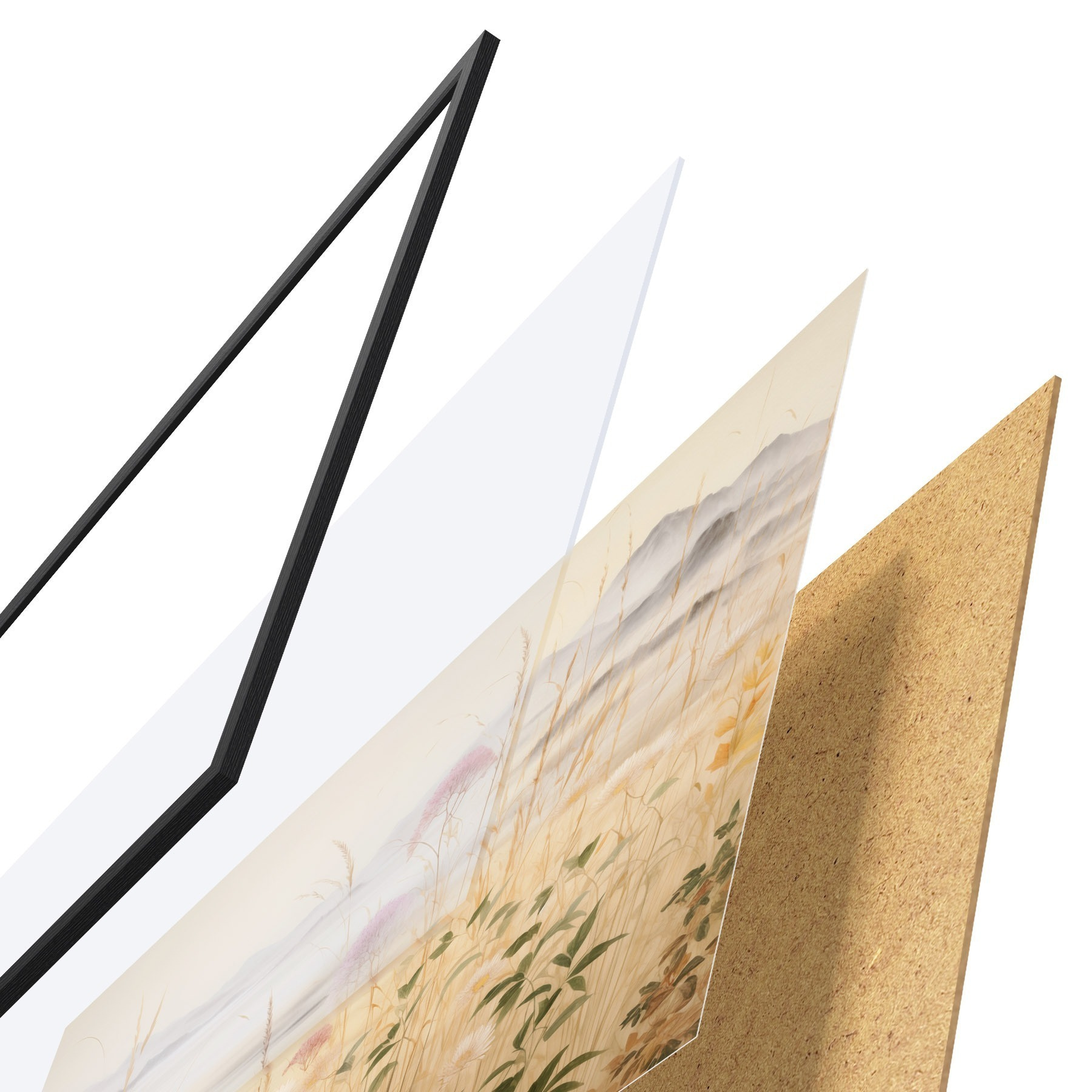 El póster consta de marco, plexiglás, imagen impresa y soporte de aglomerado. El póster puede colgarse inmediatamente en la pared gracias a los soportes de la parte posterior.