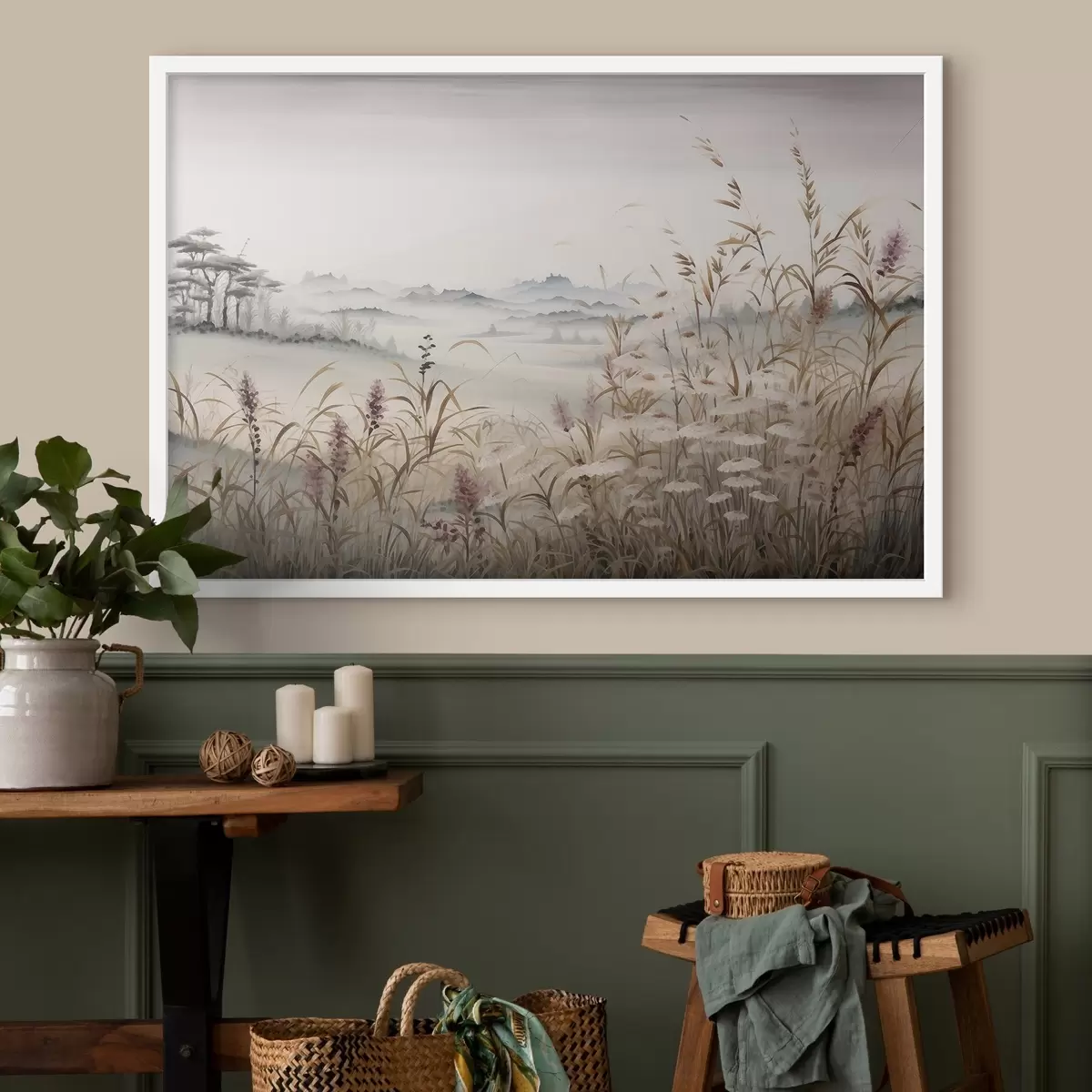 Poster Paisaje brumoso con pastos f48481