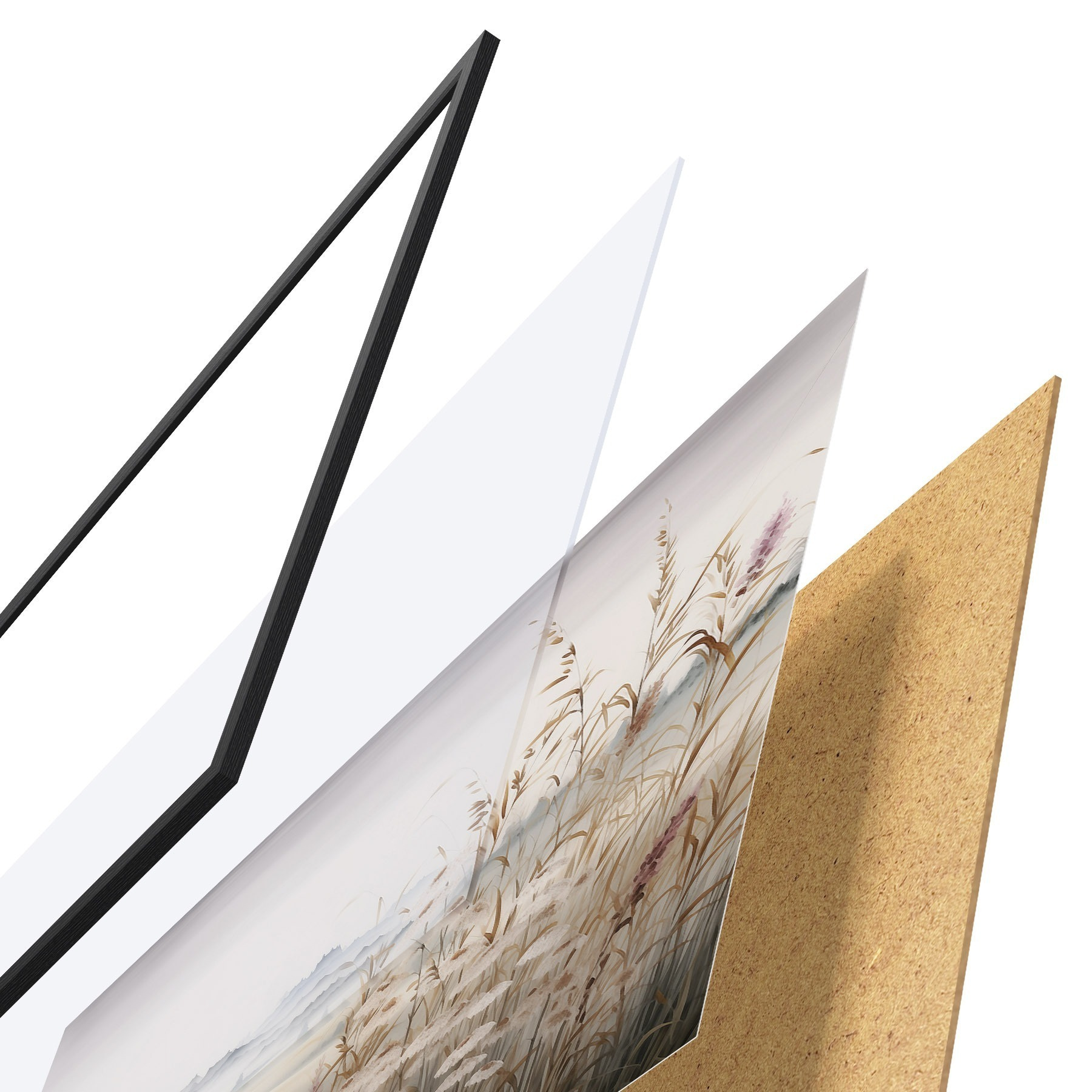 El póster consta de marco, plexiglás, imagen impresa y soporte de aglomerado. El póster puede colgarse inmediatamente en la pared gracias a los soportes de la parte posterior.