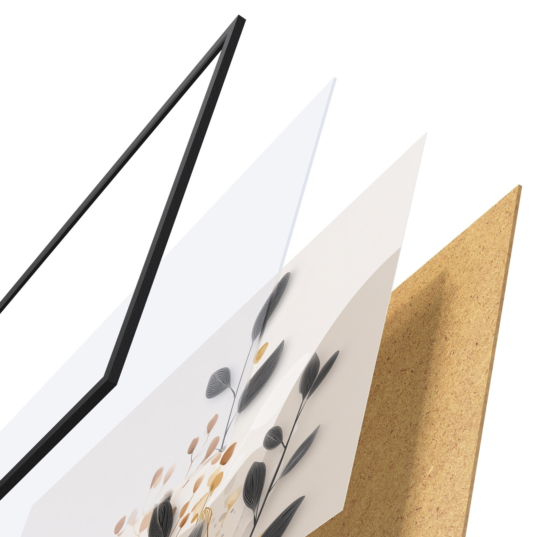 El póster consta de marco, plexiglás, imagen impresa y soporte de aglomerado. El póster puede colgarse inmediatamente en la pared gracias a los soportes de la parte posterior.