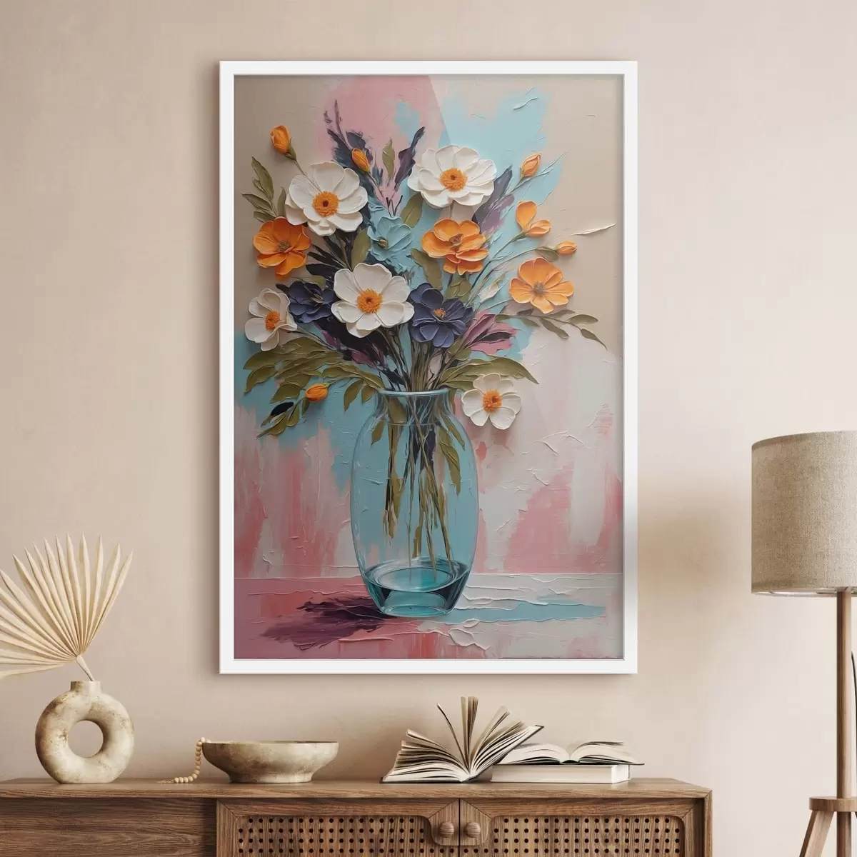 Poster Ramo de flores en un jarrón de cristal sobre un fondo colorido f48488