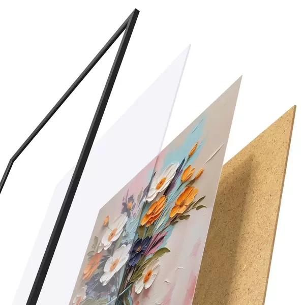 El póster consta de marco, plexiglás, imagen impresa y soporte de aglomerado. El póster puede colgarse inmediatamente en la pared gracias a los soportes de la parte posterior.
