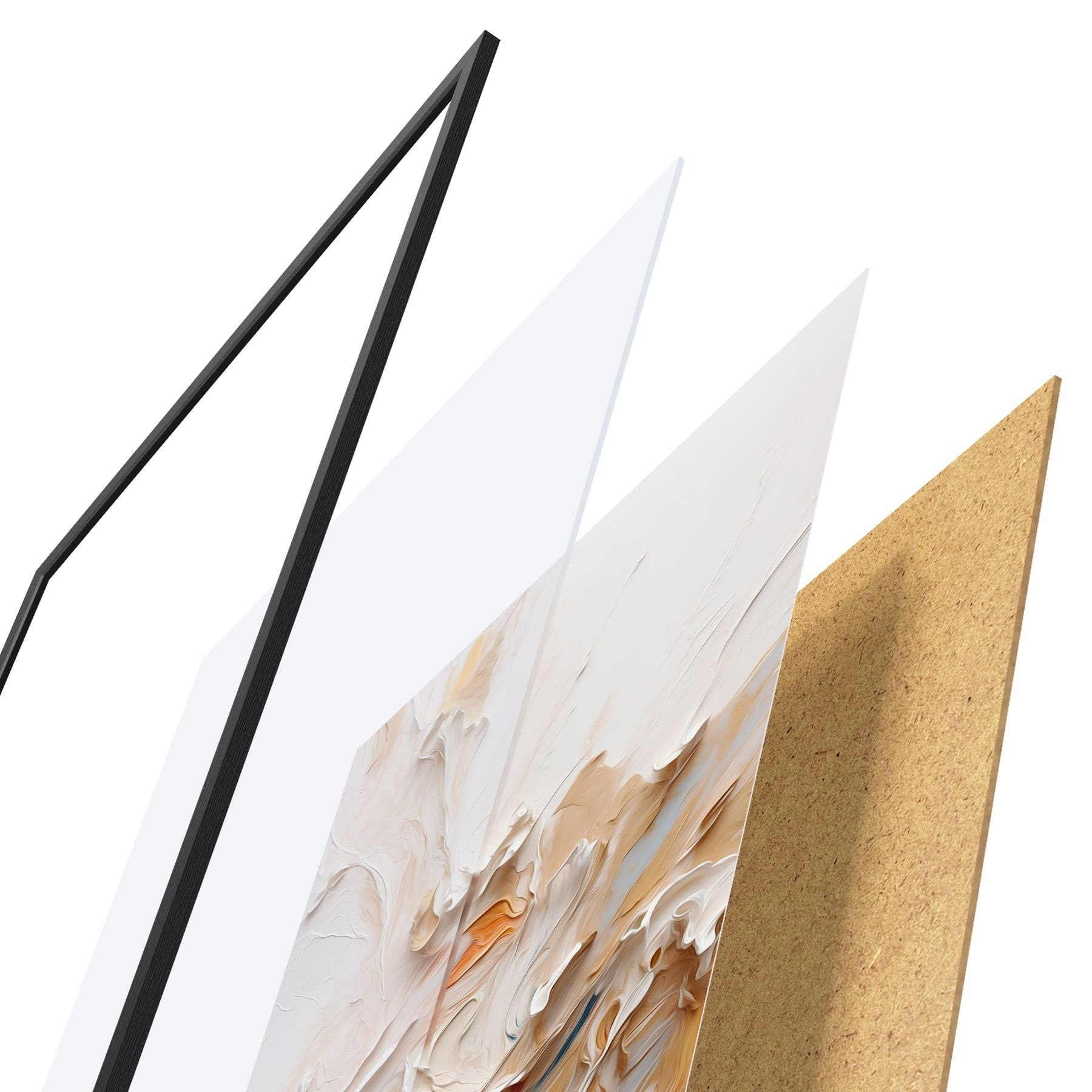 El póster consta de marco, plexiglás, imagen impresa y soporte de aglomerado. El póster puede colgarse inmediatamente en la pared gracias a los soportes de la parte posterior.