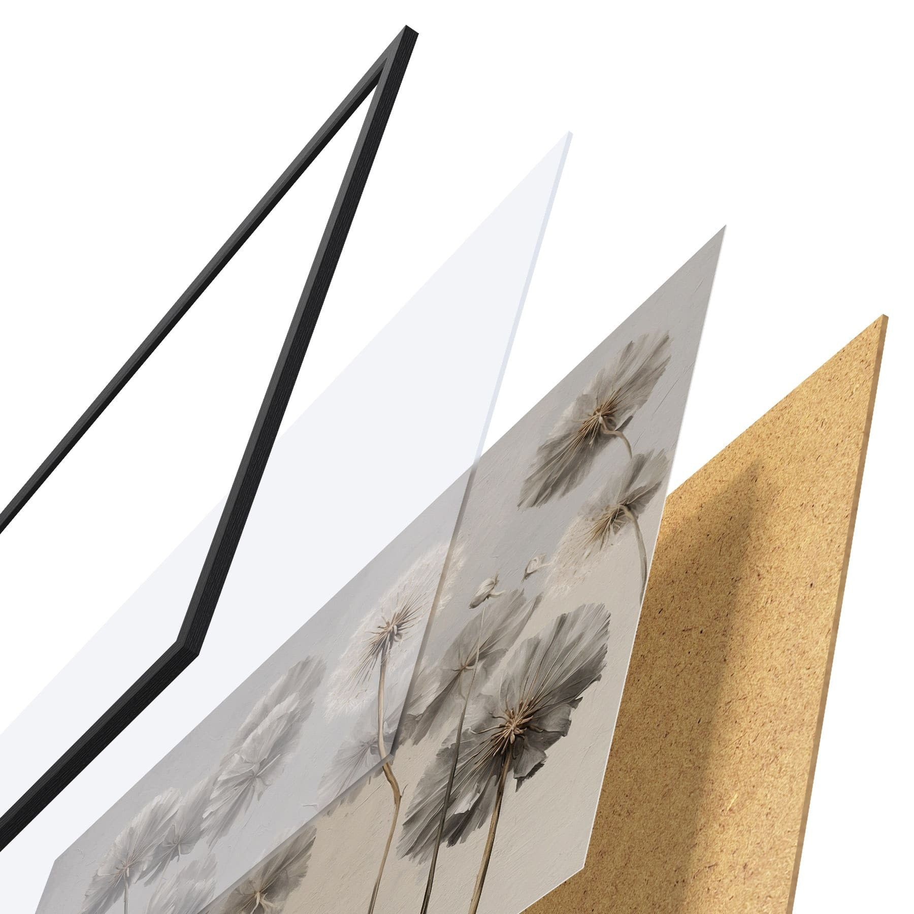 El póster consta de marco, plexiglás, imagen impresa y soporte de aglomerado. El póster puede colgarse inmediatamente en la pared gracias a los soportes de la parte posterior.