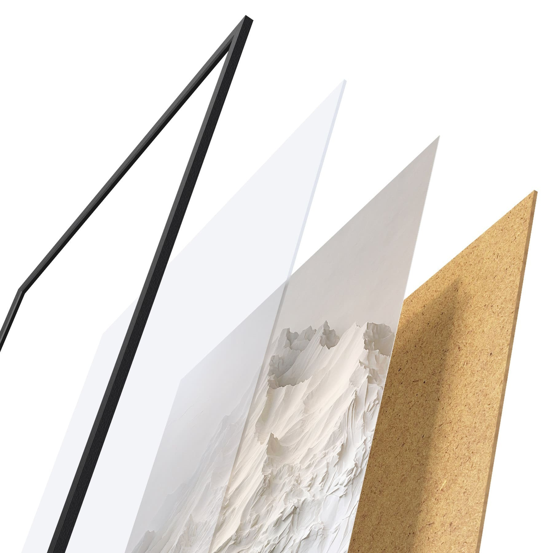El póster consta de marco, plexiglás, imagen impresa y soporte de aglomerado. El póster puede colgarse inmediatamente en la pared gracias a los soportes de la parte posterior.