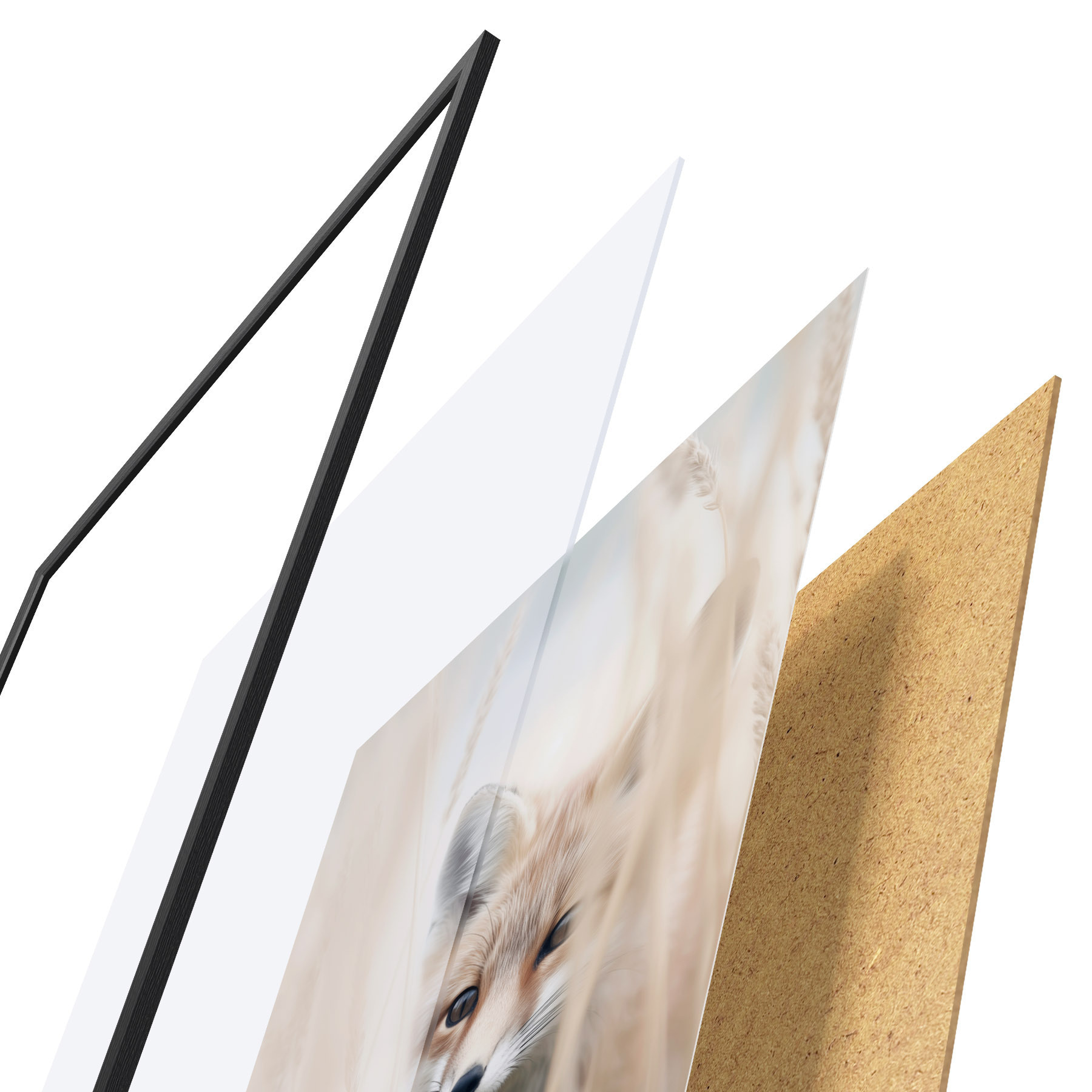 El póster consta de marco, plexiglás, imagen impresa y soporte de aglomerado. El póster puede colgarse inmediatamente en la pared gracias a los soportes de la parte posterior.
