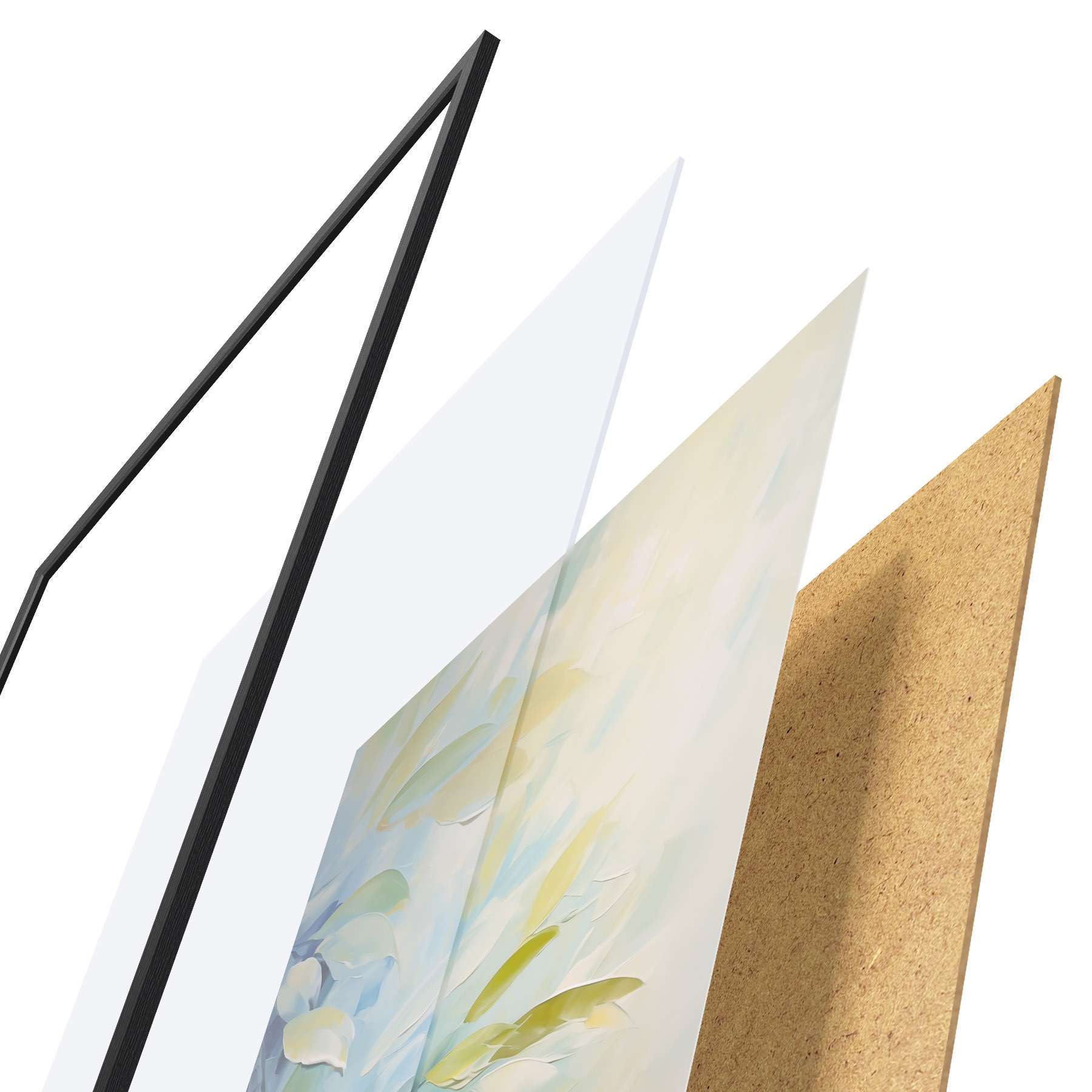 El póster consta de marco, plexiglás, imagen impresa y soporte de aglomerado. El póster puede colgarse inmediatamente en la pared gracias a los soportes de la parte posterior.