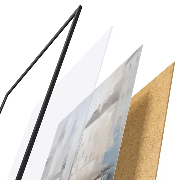 El póster consta de marco, plexiglás, imagen impresa y soporte de aglomerado. El póster puede colgarse inmediatamente en la pared gracias a los soportes de la parte posterior.