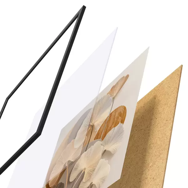 El póster consta de marco, plexiglás, imagen impresa y soporte de aglomerado. El póster puede colgarse inmediatamente en la pared gracias a los soportes de la parte posterior.