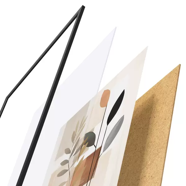 El póster consta de marco, plexiglás, imagen impresa y soporte de aglomerado. El póster puede colgarse inmediatamente en la pared gracias a los soportes de la parte posterior.