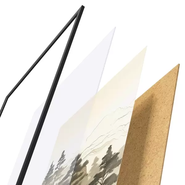 El póster consta de marco, plexiglás, imagen impresa y soporte de aglomerado. El póster puede colgarse inmediatamente en la pared gracias a los soportes de la parte posterior.