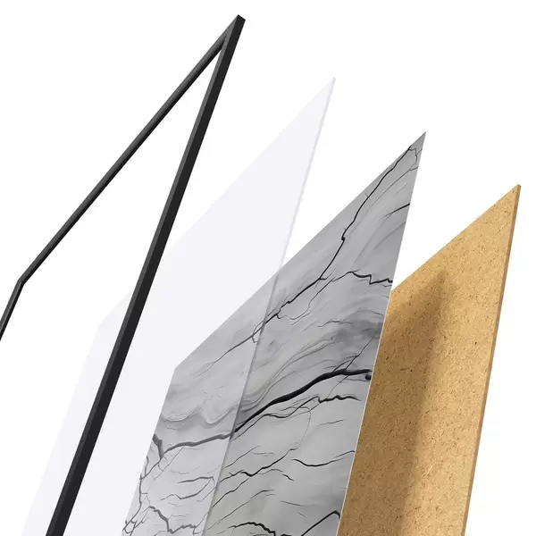 El póster consta de marco, plexiglás, imagen impresa y soporte de aglomerado. El póster puede colgarse inmediatamente en la pared gracias a los soportes de la parte posterior.