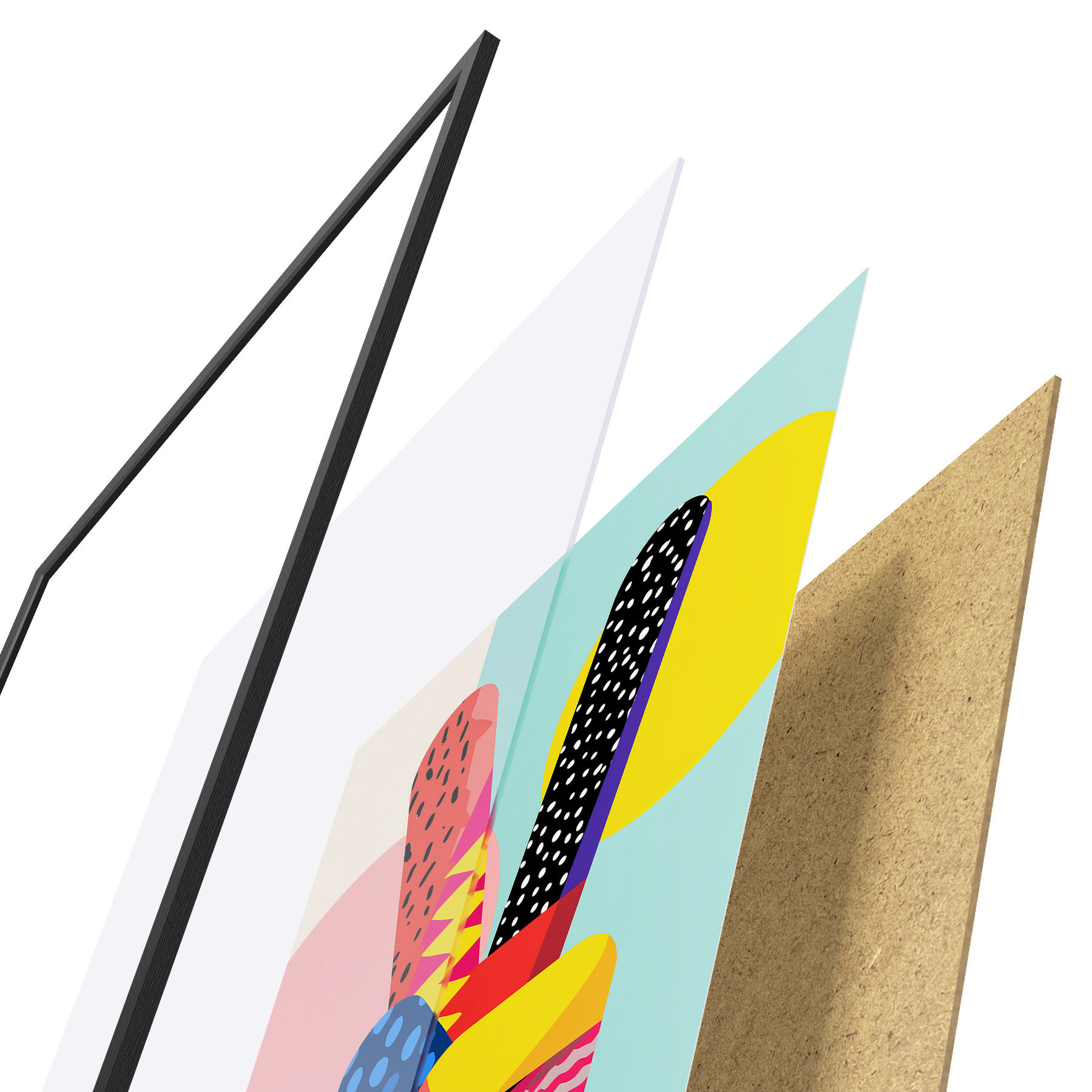 El póster consta de marco, plexiglás, imagen impresa y soporte de aglomerado. El póster puede colgarse inmediatamente en la pared gracias a los soportes de la parte posterior.