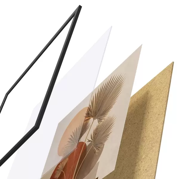 El póster consta de marco, plexiglás, imagen impresa y soporte de aglomerado. El póster puede colgarse inmediatamente en la pared gracias a los soportes de la parte posterior.