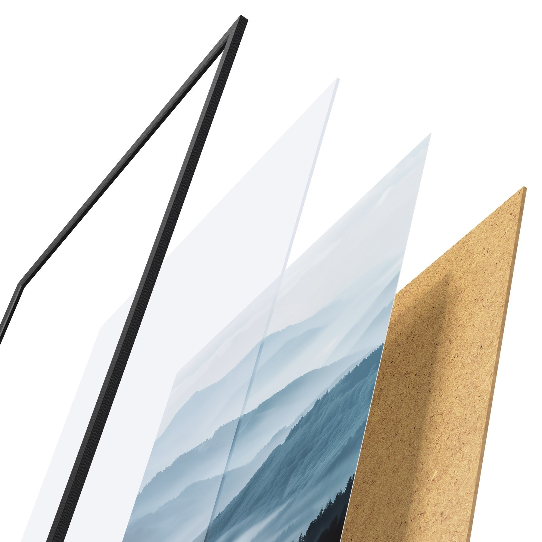 El póster consta de marco, plexiglás, imagen impresa y soporte de aglomerado. El póster puede colgarse inmediatamente en la pared gracias a los soportes de la parte posterior.