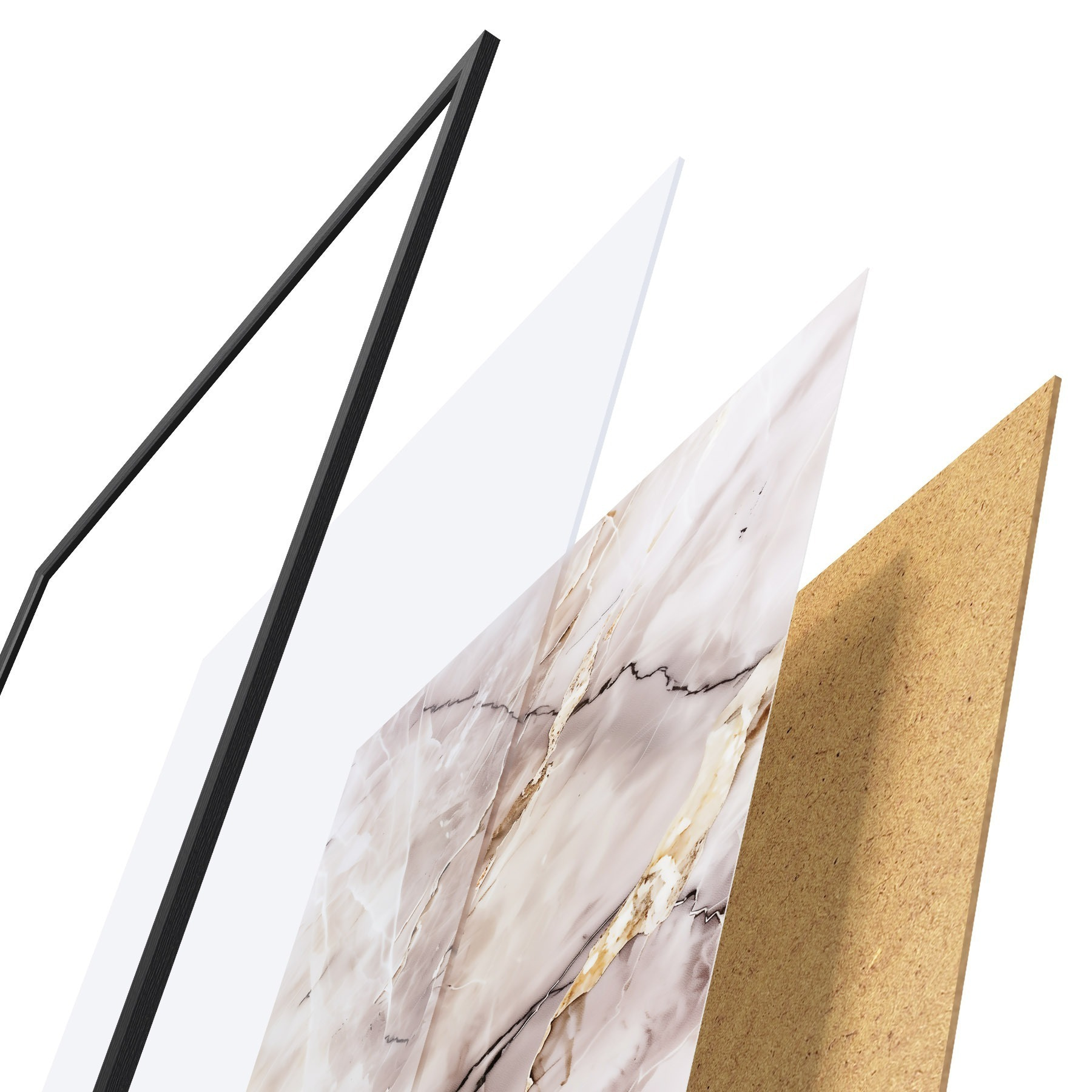 El póster consta de marco, plexiglás, imagen impresa y soporte de aglomerado. El póster puede colgarse inmediatamente en la pared gracias a los soportes de la parte posterior.