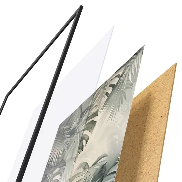 El póster consta de marco, plexiglás, imagen impresa y soporte de aglomerado. El póster puede colgarse inmediatamente en la pared gracias a los soportes de la parte posterior.